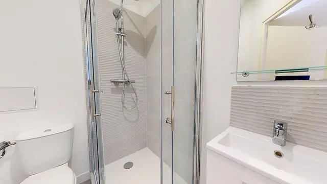 La chambre 2 dispose d’un lit double, d’une table de chevet accompagnée d’une lampe, d’un meuble dressing, d’une TV murale, d’un bureau accompagné d’une chaise et enfin, d’une salle de bain privative munie d’une douche, d’un WC, et d’un meuble vasque.