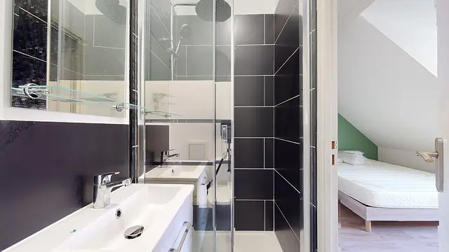 Les chambres sont similaires et disposent d’un lit double, d’une table de chevet accompagnée d’une lampe, d’un meuble dressing, d’une TV murale, d’un bureau accompagné d’une chaise et enfin, d’une salle de bain privative munie d’une douche, d’un WC, et d’un meuble vasque.