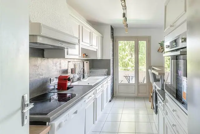 - Une cuisine équipée d'un réfrigérateur, de plaques de cuisson, d'une hotte, d'un four, d'un four micro-ondes, d'une machine à café et de nombreux rangements. Une porte-fenêtre menant sur le balcon apporte de la clarté à cet espace.
