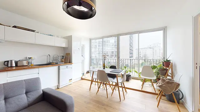 Cet appartement de 5 pièces s'ouvre sur une entrée avec rangements desservant un séjour avec cuisine ouverte. Celui-ci dispose d'un espace salon avec canapé, table basse, meuble TV et TV et d'un espace salle à manger, parfait pour partager des repas entre colocataires.