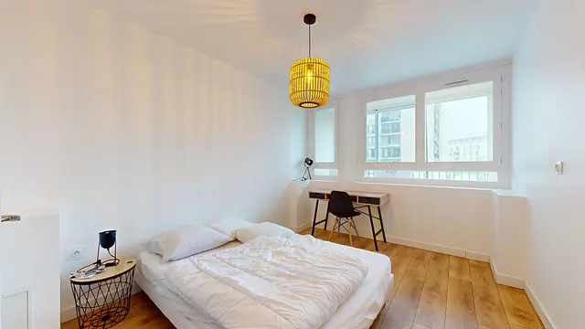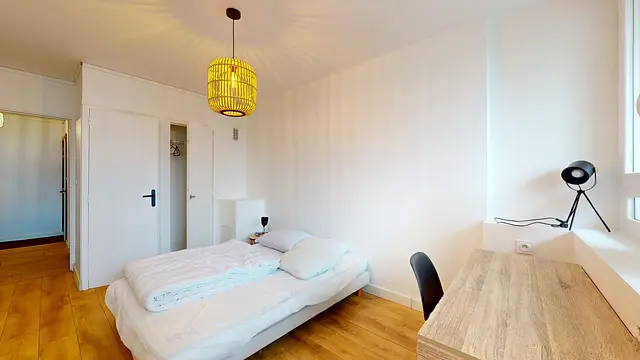 Cette chambre possède un lit double, bureau, ainsi qu'un placard de rangement.