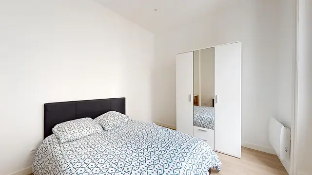 Cette chambre dispose d'un lit double, d'un bureau, d'un meuble de rangement et d'une armoire.