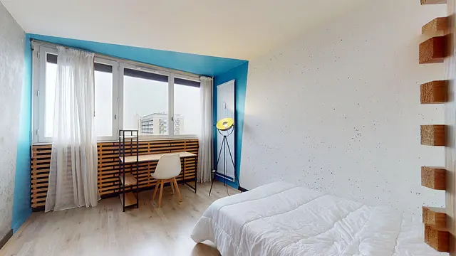 La chambre est équipée d’un lit double, d’un bureau, d’une lampe d’ambiance, de rangements ainsi que d’une penderie.