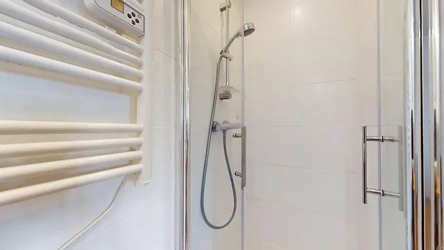 La chambre est équipée d'un bureau, d'un lit double, d'une penderie et d'une salle de bain privative avec douche, meuble vasque, miroir.