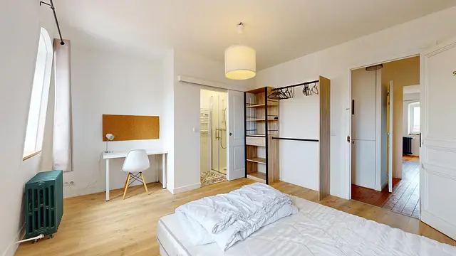 La chambre est équipée d'un bureau, d'un lit double, d'une penderie et d'une salle de bain privative avec douche, meuble vasque, miroir.