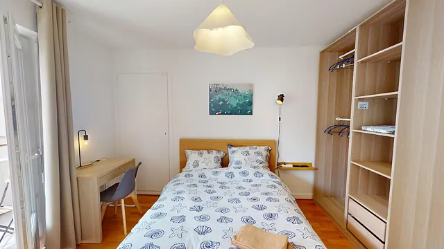 La deuxième chambre donne accès au balcon. Elle est lumineuse et bien agencée, avec un espace bureau intégré et une grande penderie.
