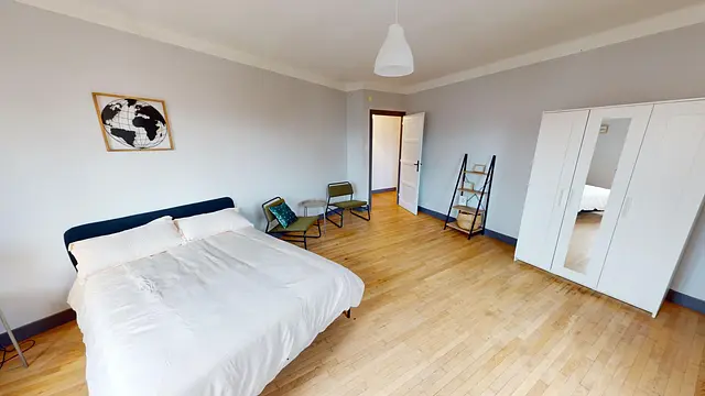 🌛Oqoro vous propose une chambre de 25,28 m² composée d'un lit double, d'un bureau avec une chaise et d'un placard. Également, vous disposez de deux chaises, d'une commode.