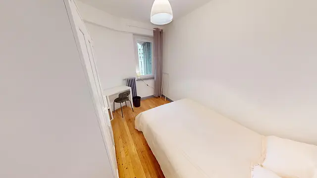 🌛Oqoro vous propose une chambre de 8,77 composée d'un lit double, d'un bureau avec une chaise et d'un placard.
