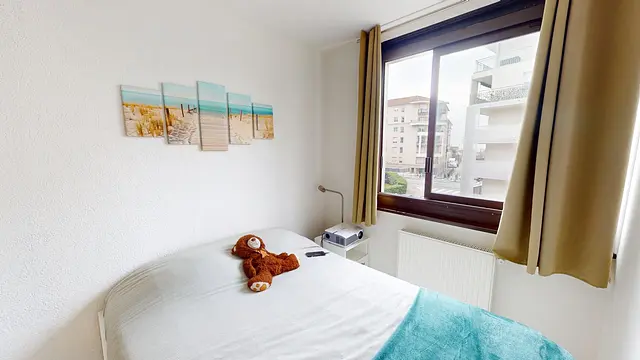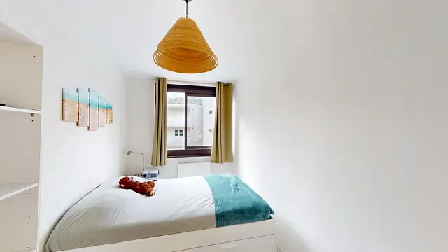 Cette chambre dispose d'un lit double avec un sommier à tiroirs, d'un bureau avec une lampe et une chaise, d'une table de chevet, d'une bibliothèque ainsi que d'une armoire.