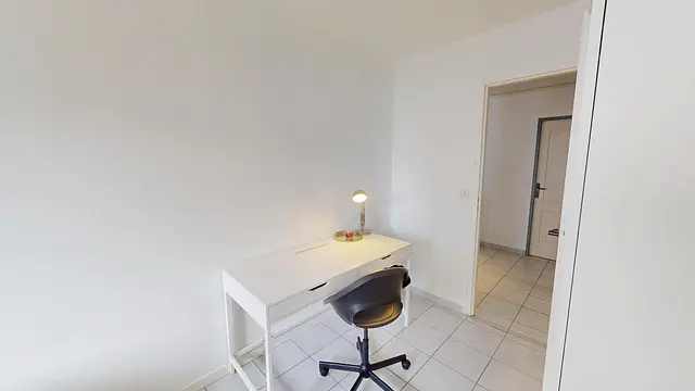 Cette belle colocation de quatre chambres, s'ouvre sur une grande pièce de vie, aménagée d'un canapé, d'un meuble à chaussures, d'un meuble TV avec une télévision, d'une table basse ainsi que d'une table avec quatre chaises, idéal pour partager des repas entre colocataires.