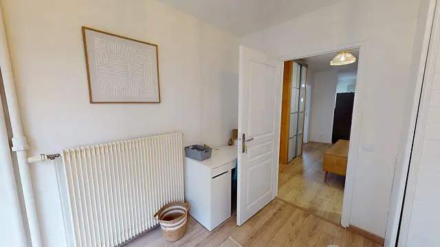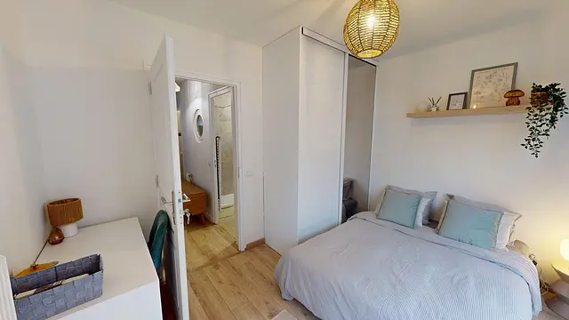 La chambre est aménagée avec un lit double, un bureau, un placard de rangement ainsi qu’une table de chevet. Lumineuse et agréable, elle offre un accès direct au balcon, idéal pour profiter d’un espace extérieur au quotidien.