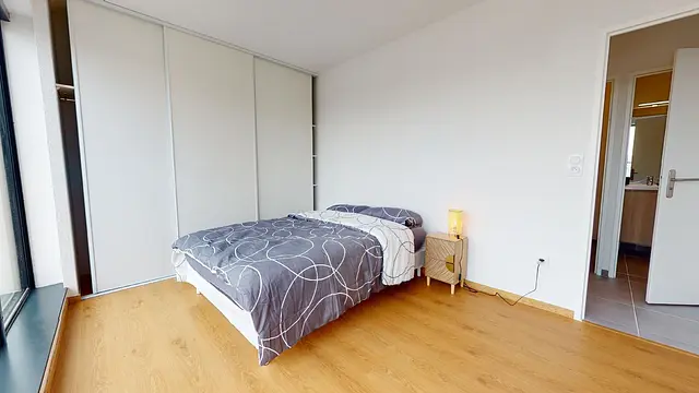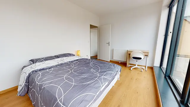 Cette chambre se compose d'un lit double, d'une armoire de rangement, d'un bureau accompagné d'une chaise, et d'une table de chevet accompagné d'une lampe. Cette chambre à un accès direct à la terrasse de l'appartement.