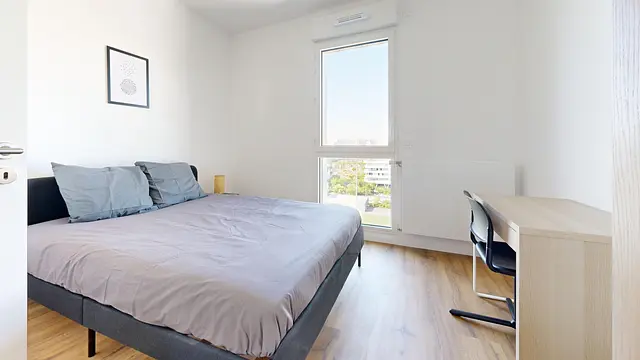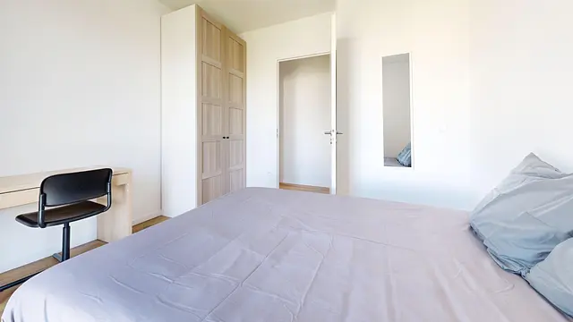 La chambre est lumineuse et bien agencée. Elle est équipée d’un lit double, d’un bureau et de rangements de type dressing ou armoire. Le parquet et les murs clairs apportent une ambiance simple et agréable, idéale pour un usage quotidien.
