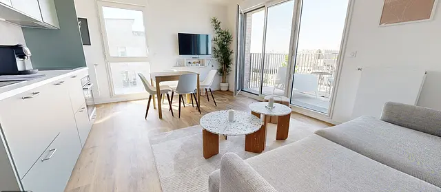 L’appartement s’ouvre sur une agréable pièce de vie lumineuse, aménagée avec un canapé, une table basse et un espace repas convivial. De larges ouvertures permettent une belle entrée de lumière naturelle et donnent accès à l’extérieur. La cuisine, ouverte sur le séjour, est moderne et entièrement équipée avec des meubles aux lignes épurées, un four, un micro-ondes, une plaque de cuisson, un réfrigérateur, un lave-vaisselle ainsi que de nombreux rangements.