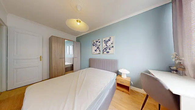 La chambre dispose d'un lit double, d'un placard de rangement, d'un bureau et d'une table de chevet.