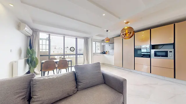 La pièce de vie est meublée avec un canapé ultra confortable, une table basse, un meuble TV avec son écran plat déjà installé et un coin salle à manger convivial pour partager vos repas. C’est un espace hyper lumineux grâce aux immenses baies vitrées qui ouvrent sur un balcon filant.