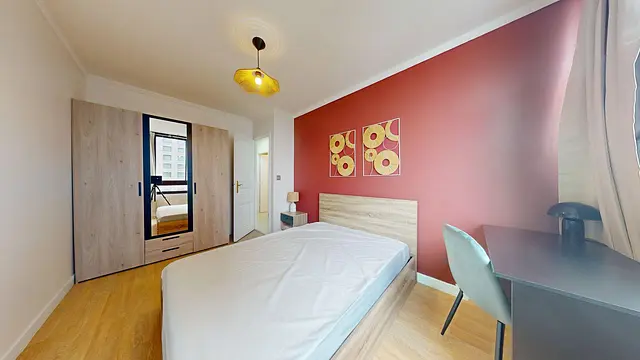 La chambre dispose d'un lit double, d'un placard de rangement, d'un bureau et d'une table de chevet.