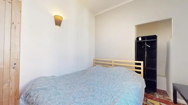 Cette chambre est équipée d'un lit double, d'une armoire et d'un bureau.