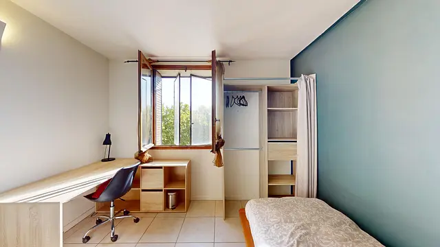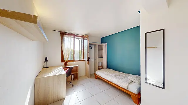 Cette chambre se compose d'un lit simple, d'un miroir, de rangement et d'un bureau avec une chaise.
