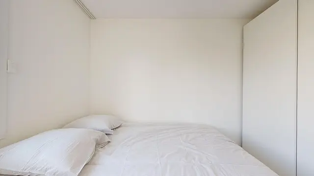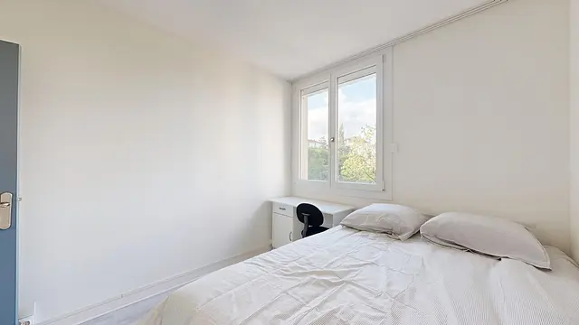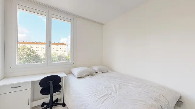 Cette chambre lumineuse, grâce à une grande fenêtre, dispose d'un lit double, d'un bureau avec sa chaise et un grand placard.