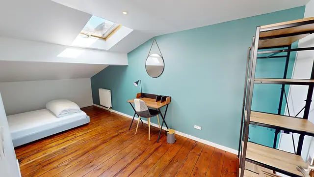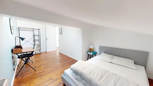 Cette chambre est aménagée avec goût et comprend un lit double, une table de chevet, un bureau avec une chaise et des rangements. Le locataire de celle-ci partage la salle d'eau du dernier étage avec le locataire de la chambre 6.