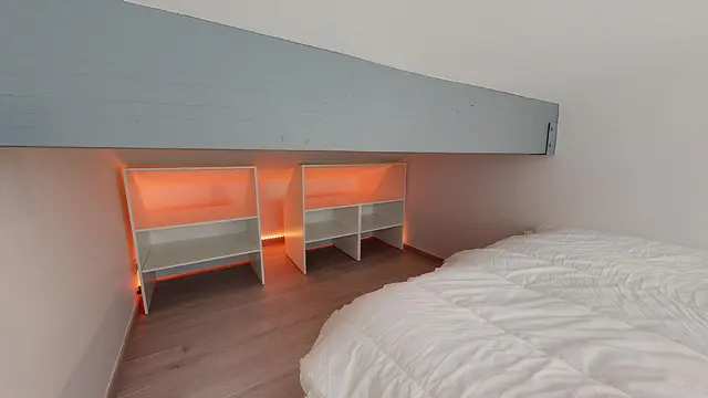 A noter que le meuble de rangement tête de lit et le lit sont installés sur roulette, afin, si on le souhaite, d’être déplacés dans la journée sur la partie mansardée de la chambre et ainsi pouvoir profiter de plus de place en journée.