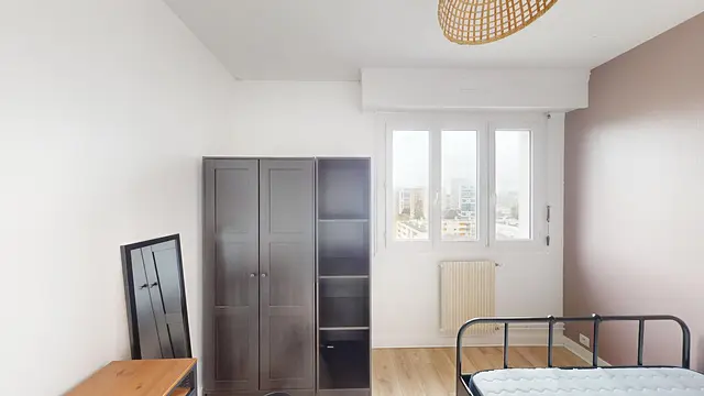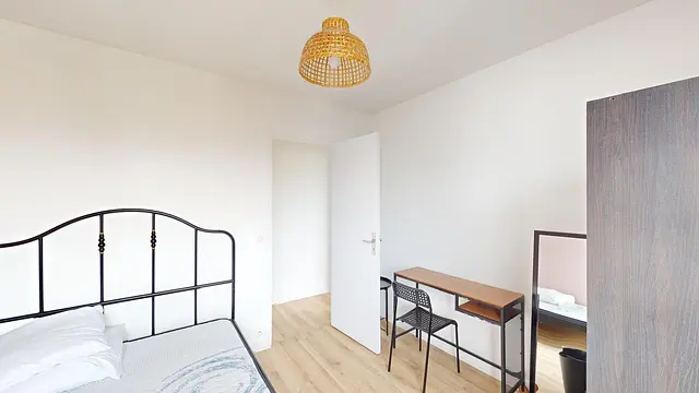 Cette chambre est lumineuse et dispose d'un lit double, d'un bureau et d'un meuble de rangement.