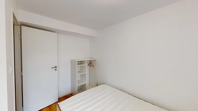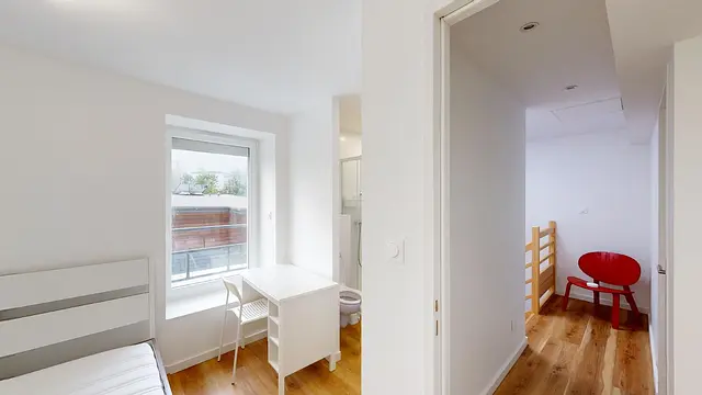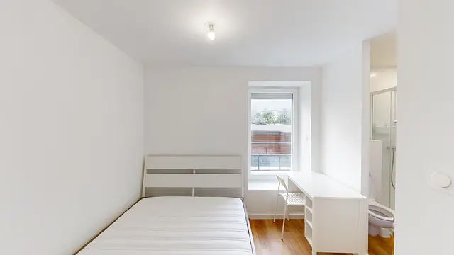 Cette chambre dispose d'un lit double, un meuble de rangements, un bureau avec une chaise. La salle de bain privative se compose d'un WC, une cabine de douche ainsi qu'un meuble vasque avec un miroir.