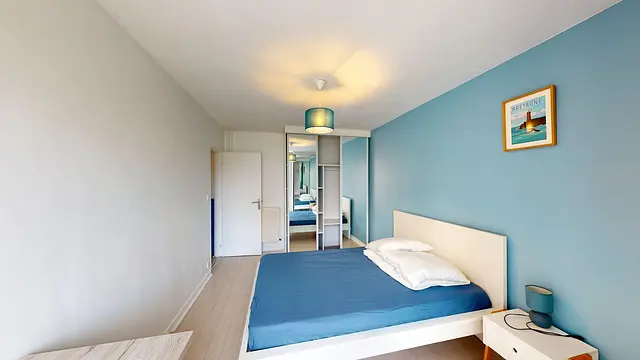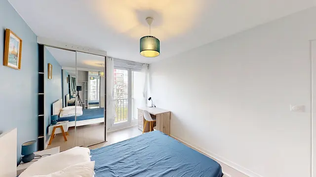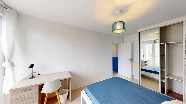 La chambre est la plus spacieuse de la colocation. Elle est équipée d’un lit double, d’un bureau, d’un placard de rangement ainsi que d’une table de chevet.