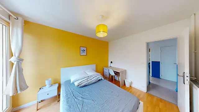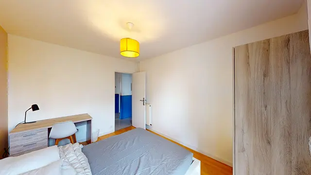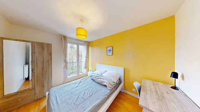 Elle est équipée d’un lit double, d’un bureau, d’un placard de rangement ainsi que d’une table de chevet.