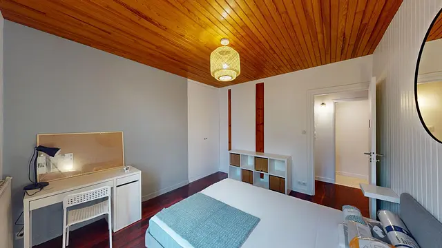 La chambre est louée avec un bureau, un lit, un placard mural, ainsi qu'un meuble de rangements.
