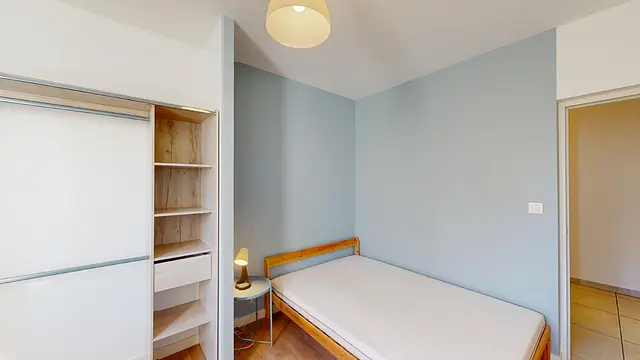 Cette chambre propose un lit simple, un grand dressing pour vos affaires, une armoire de rangement ainsi qu'un bureau.