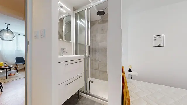 Cette chambre dispose d'un lit double, d'un chevet, d'un bureau, d'une chaise, d'une armoire et donne accès à une salle de bain privative équipée d'une douche et d'un meuble vasque.