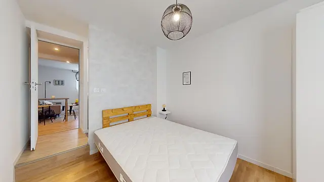 L'appartement est composé d'une cuisine équipée (réfrigérateur, four encastré, plaques de cuisson, hotte, four à micro-ondes, évier, et autres appareils) ouverte sur le salon et séparée par une table haute et quatre tabourets. Le coin salon est équipé d'un canapé, d'une table basse, d'une télévision et de son meuble. À l'entrée de l'appartement, vous trouverez un porte-manteau ainsi qu'un petit buffet. Par cette dernière, vous rejoindrez trois des chambres et les toilettes.