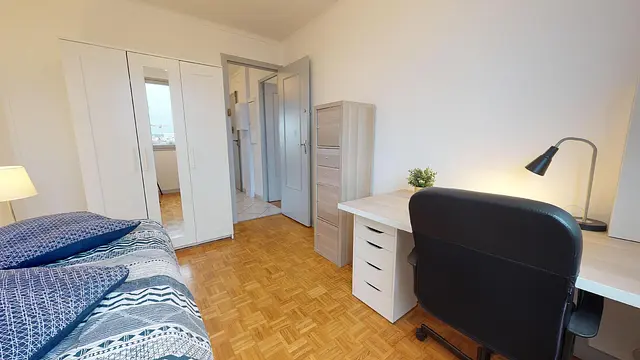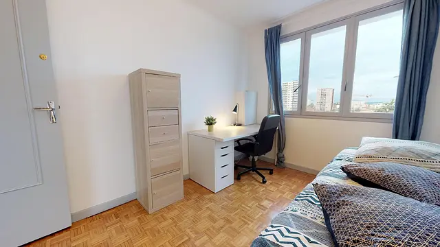 La chambre 2 bénéficie du même ameublement que les deux autres: lit simple modulable en lit double équipé de grands tiroirs de rangements, table de nuit avec lampe de chevet, bureau, grand placard avec penderie et petite colonne avec tiroirs. Egalement lumineuse et sans vis-à-vis, elle est calme et spacieuse.