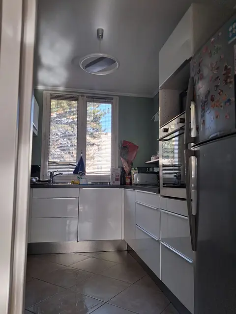 Partie jour: Salon lumineux, balcon, salon, canapé, tv. Cuisine de équipée avec un réfrigérateur/congélateur, induction, four, micro onde, lave vaisselle, vaisselle, salle de bain avec lave-linge, sèche linge, étendoir. toilette séparé, salle de bain avec baignoire.