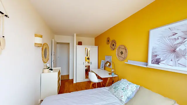 Jolie chambre composée d'un bureau, d'un lit double et d'un grand placard.