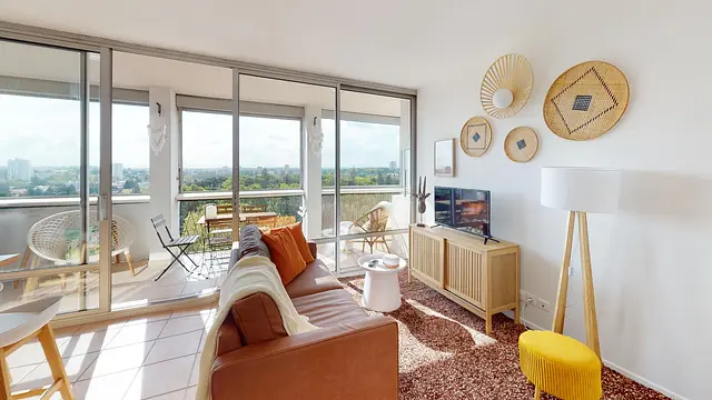 Ce vaste T7 situé au 11ème étage avec ascenseur a été conçu pour offrir un maximum de confort à ses occupants. La pièce de vie principale se compose d'un salon lumineux ouvert sur une cuisine moderne et entièrement équipée avec un four, un micro-ondes, une machine à café et deux réfrigérateurs pour faciliter l'organisation.