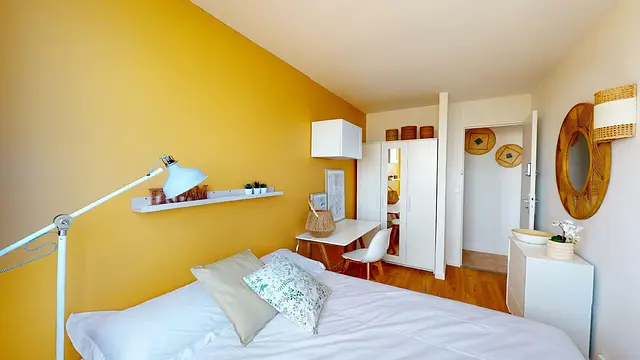 Jolie chambre composée d'un bureau, d'un lit double et d'un grand placard.