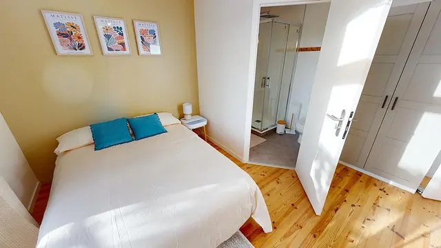 Elle dispose d'une salle d'eau privative avec douche, meuble vasque et WC.