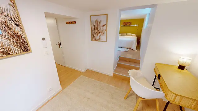 Elle est équipée d'un lit double, bureau, placard de rangement.