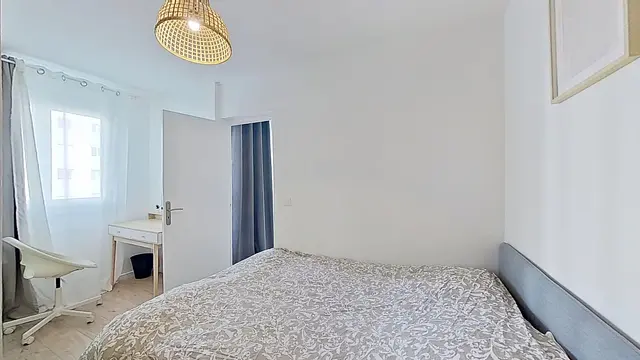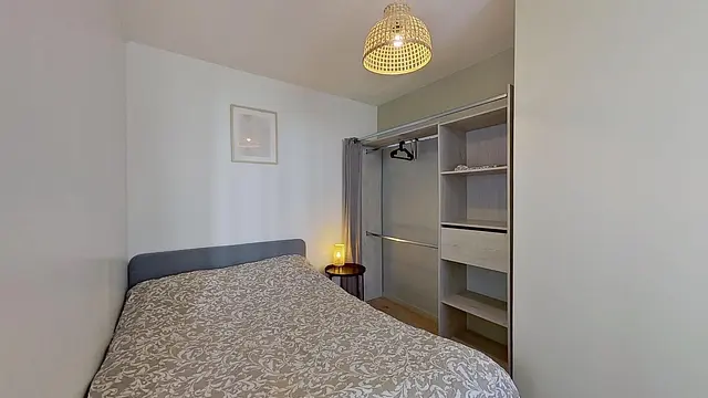 Elle est meublée avec un lit double, une commode de chevet, un placard de rangement et un bureau.