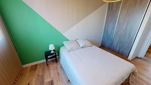 La chambre 4, la plus grande de la colocation avec ses 13m2 est située à droite de l’entrée. Cette chambre comporte : un lit double , un bureau, une chaise et des rangements.