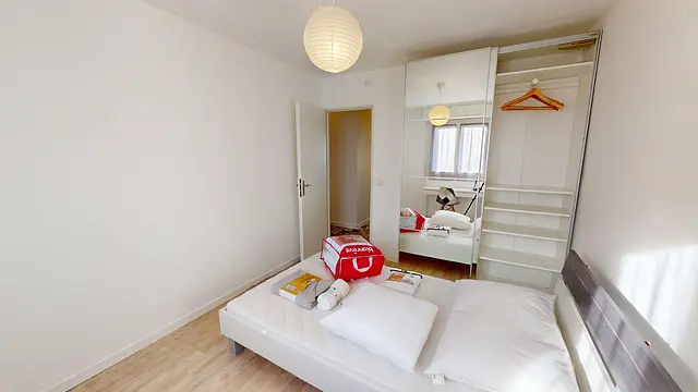 Elle est équipée d'un lit double, bureau, chaise, placard de rangement, d'un miroir, une bibliothèque et d'une table de chevet avec sa lampe.