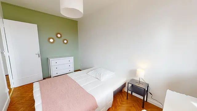 Cette chambre est meublée d'un lit double, d'un bureau simple, d'une commode ainsi que d'une table de nuit. Un grand espace de rangement partagé est également accessible dans le couloir.