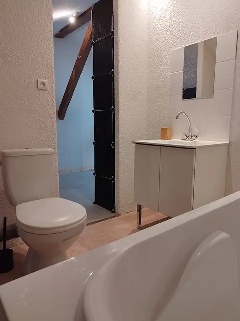 La colocation comporte 5 chambres (une non shootée) avec chacune leur salles de bains privatives en mezzanine avec baignoire et WC.