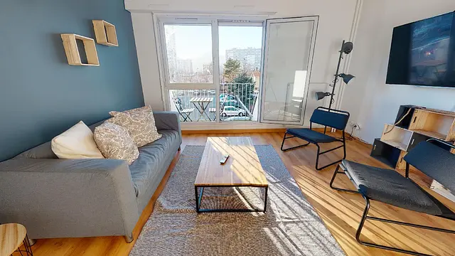 Cette colocation comporte un salon lumineux aménagé avec un canapé, une table basse, des fauteuils, une TV, etc. Les baies vitrées s’ouvre sur un balcon avec une table et des chaises.