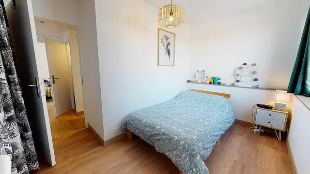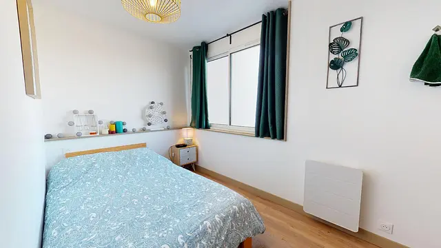La 3e chambre, située sur la droite de l'appartement, dispose, comme les autres, d'une belle lumière et d'un mobilier complet : lit double, table de nuit, bureau, grande armoire et lavabo. Confort idéal.