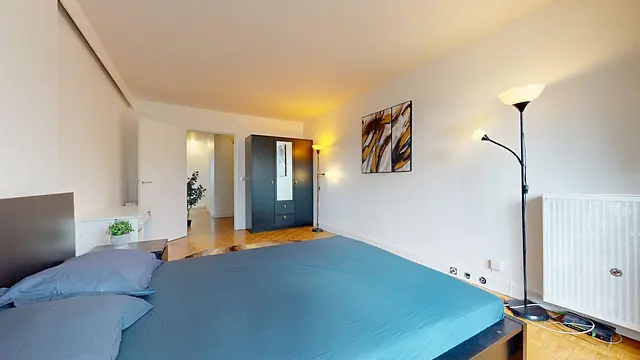 La chambre 1 est la plus spacieuse, avec 18 m², et donne accès au balcon, partagé avec la cuisine. Elle est équipée d’un lit double, d’une armoire et d’un bureau.