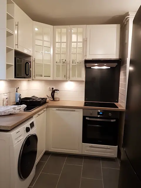 L'appartement comporte une cuisine avec four, frigo, plaques de cuisson, hotte, micro-ondes, machine à laver et rangements.